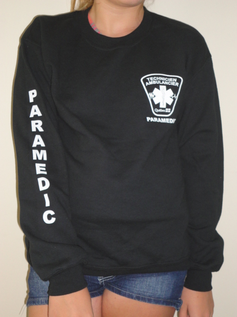 Coton ouaté noir 15.5 oz. 50% coton / 50% polyester. Col arrondi et manches montées. Double piqûre au col, aux manches et à la taille. Sérigraphie logo TECHNICIEN AMBULANCIER \PARAMEDIC